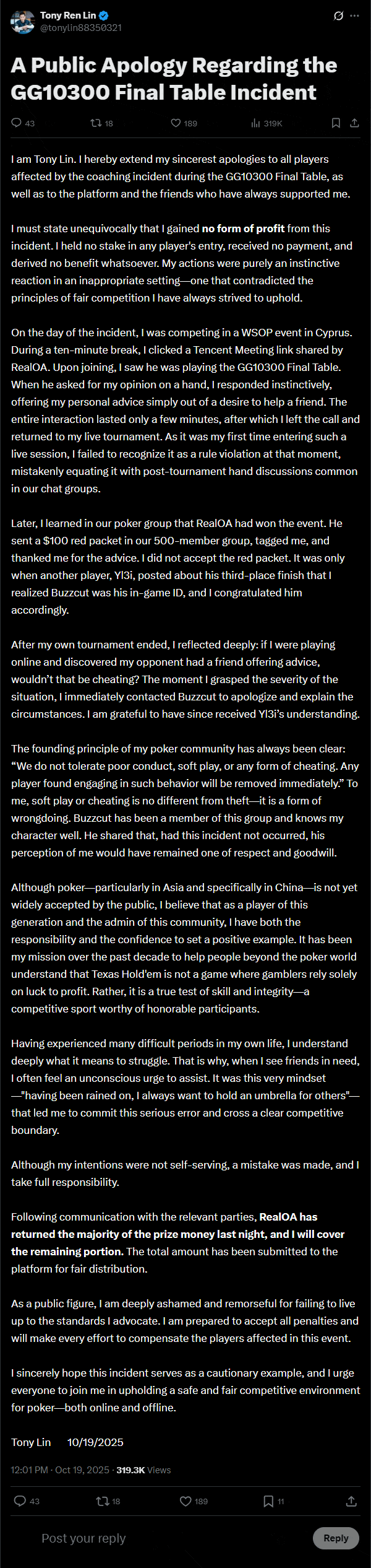 RealOA intentionally sought advice to gain an advantage over his opponent in violation of the rules at GGPoker. Lin, who acted as a coach, has acknowledged his mistake and demonstrated accountability for his role in this incident.