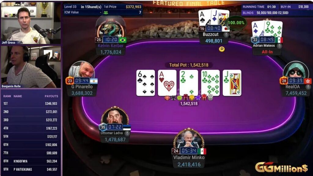 With only eight players at the final table instead of nine, viewers might have expected the action to have been more aggressive, but this week’s GGMillion$ final table was one of the more passive ones in recent weeks. This may have had a lot to do with losing players who rely on their natural aggression early. Both Adrian Mateos and Ottomar Ladva busted before the final five, which left ‘RealOA’ as a huge chip leader.