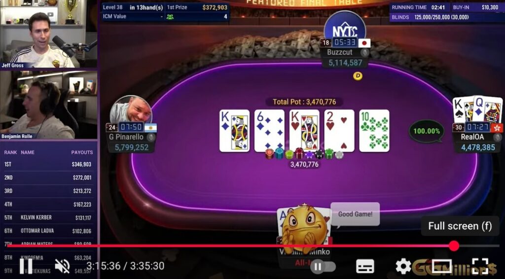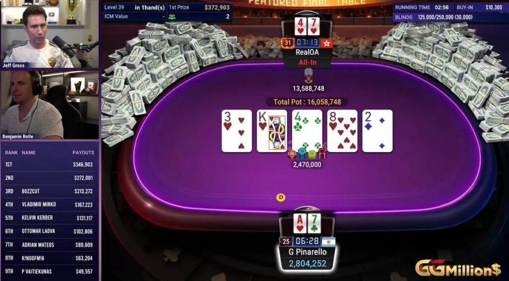 The $10,000-entry GGPoker GGMillion$ brings the cream of the crop to the poker felt every week, and this week was no different. Regular host, Jeff Gross, was joined by the WSOP Online Main Event champion Benjamin Rolle on comms. The German pro enjoyed one of his best days at the online felt a few weeks ago, and calling the action on a rare week he wasn’t in play at the final table, Rolle added a lot to proceedings as the big names at the felt let two smaller names through the gaps in their armor.