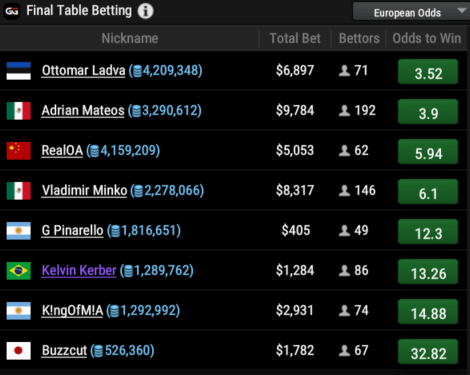 Elsewhere, Argentina’s Guilhermo Pinarello began with 36 big blinds at odds of 12.14, as did his countryman, ‘KingofM!A’, with 26 big blinds, priced up at 13.32. Brazilian Kelvin Kerber had the same starting stack at slightly longer odds of 14.68, while Japanese player ‘Buzzcut’ was the favorite for the chop at outsider odds of 32.48 due to holding just 11 big blinds at the start of play.