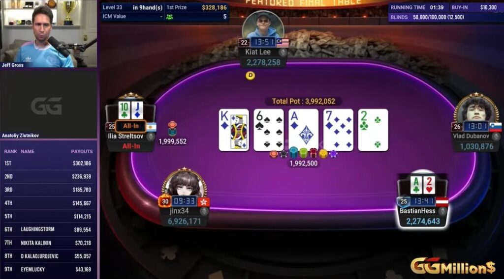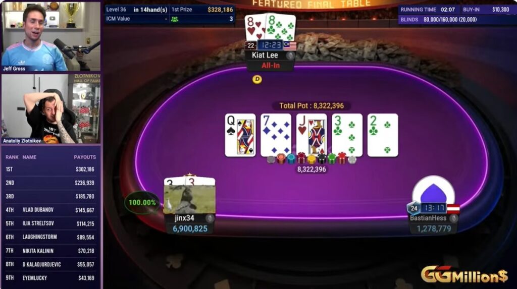 Rekor luar biasa ‘selalu menang setiap kali mencapai meja final’ berlanjut untuk ‘jinx34’ saat mereka mengejutkan pemain-pemain seperti Wai Kiat Lee, Nikita Kalinin, dan kualifikasi ‘BastianHess’ dalam ajang GGMillion$ senilai $10.300 minggu ini yang penuh ketegangan. Membawa pulang lebih dari $302.000, pertarungan terakhir menjadi contoh permainan heads-up yang hebat saat sang pemenang memberikan tekanan maksimal pada kualifikasi satelit untuk mengamankan kemenangan di meja final yang sangat sulit.